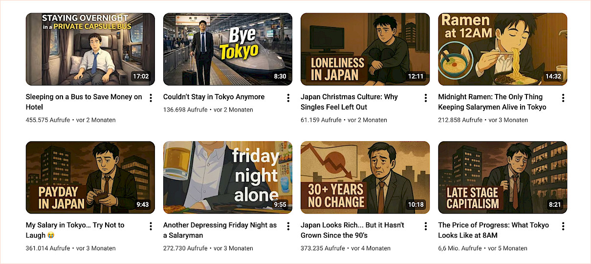 Seltsam nur, dass es mehrere YouTuber gibt, die fast identische Filme drehen. Die Thumbnails sind oft KI-generiert, echte Gesichter sind nie zu sehen. Die YouTuber agieren anonym, man sieht nur ihre Hände und Arme und manchmal einen Adamsapfel. Und die Hemden und Schuhe der Salaryman, wenn sie den Boden abfilmen. Die eigentliche Arbeit ist jedoch nie zu sehen, ebenso wenig das Büro, in dem sie 12 Stunden und länger sitzen.
